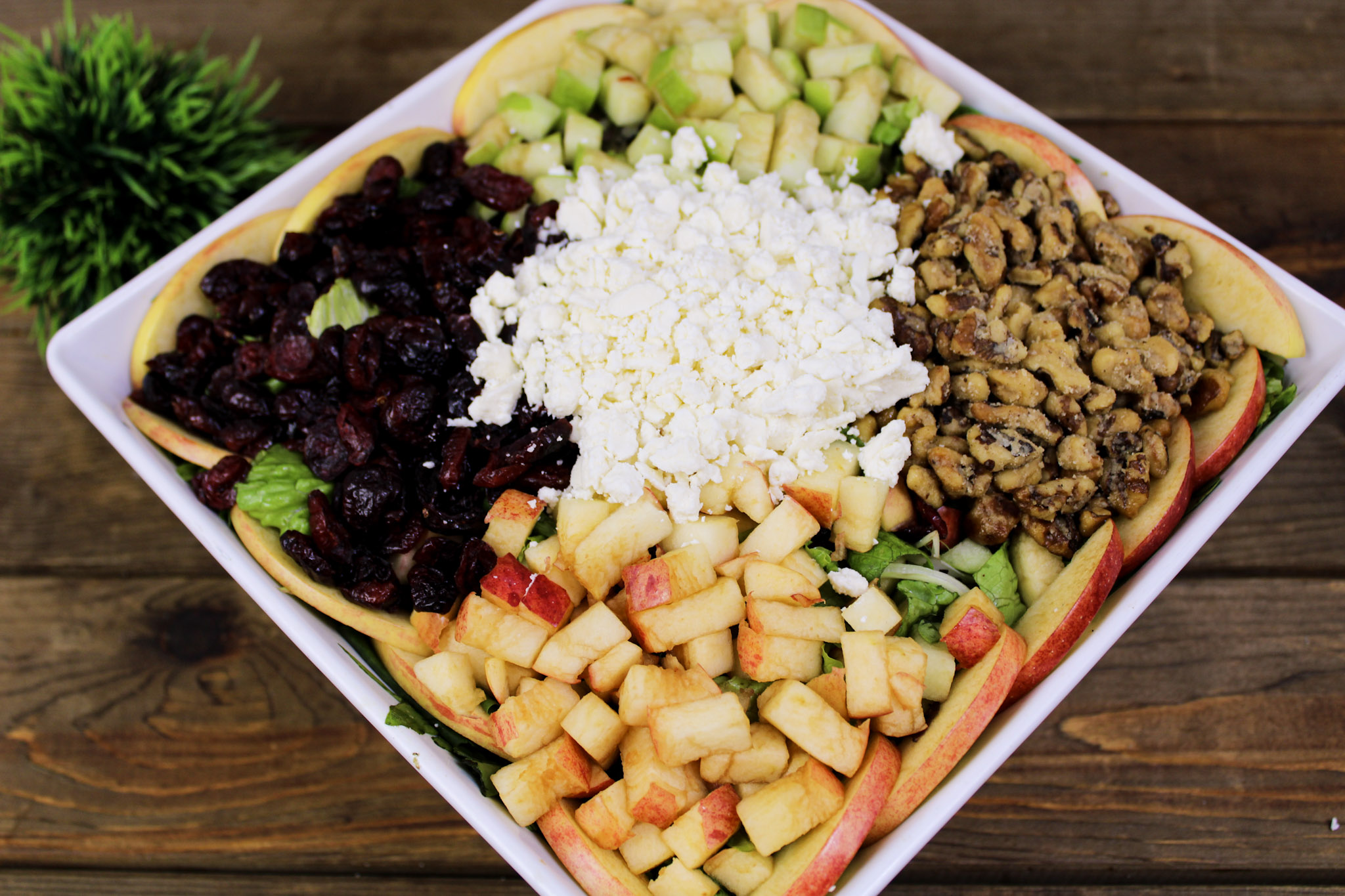 Mixed greens, Romaine lettuce, Diced red & green apples, Dried cranberries, Crumbled feta cheese & Candied walnuts